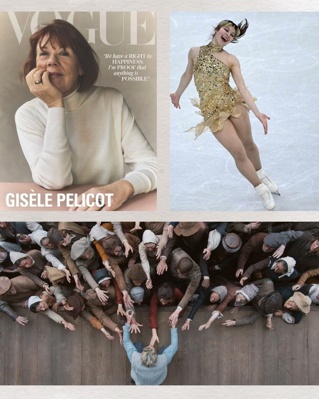 The first is Gisèle Pelicot on the cover of British Vogue, her chin resting in her hand, looking directly at the camera. You know her. She’s the woman who, after discovering her husband had drugged her and invited up to seventy men to sexually abuse her in their home for over nearly a decade, chose to take them all to trial and to make that trial public. She waived her right to anonymity so that, as she put it, shame could change sides. And now here she is on the cover of Vogue, not in spite of what happened to her but after it, saying she still has a right to happiness, that she is proof anything is possible. Just that photograph alone touches me. It’s not like I’m looking for some weirdly positive spin on terrible things. But I do respond to her defending her right to feel good again. She does it all—faces the horror and then goes on, seeking what’s good.